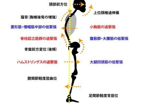骨盤が後傾し腰が曲がって円背になってくると胸の前側が常に収縮した状態で固まってしまう。すると、背中を伸ばそうとしたときに痛みを生じる場合がある。