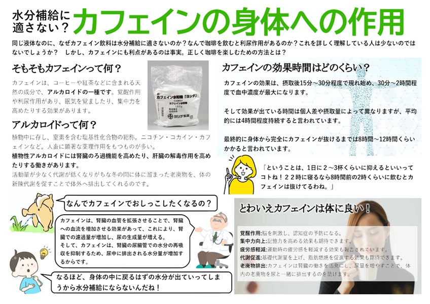 そして、カフェインは、腎臓の尿細管での水分の再吸収を抑制するため、尿中に排出される水分量が増加するからです。