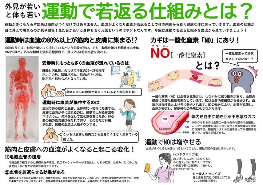 運動が体にもたらす効果は筋肉がつくだけではありません。血流がよくなり血管が若返ることで体の内側から若く健康な体に戻っていきます。血管の状態が目に見えて現れるのが肌や顔色!見た目が若いと身体も若く元気というのはホントなんです。今回は運動で若返る仕組みを血流から見ていきましょう!