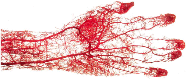 血液の多くは、動脈を勢いよく流れているという印象が強い。でも、動脈を流れる動脈血は全体の20%ほど。75%は静脈を流れる静脈血で、残り5%は毛細血管を流れる。